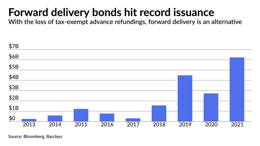 Forward delivery bonds have already surpassed their annual record for issuance as issuers use the tool, along with taxable refundings, to replace the loss of tax-exempt advance refundings.