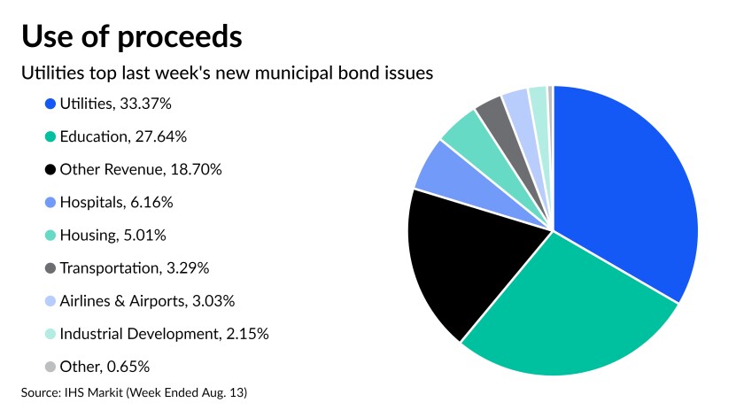 Utilities saw the top use of proceeds from the municipal bonds that were sold last week, according to IHS Markit It was followed by education and other types of revenue bonds.