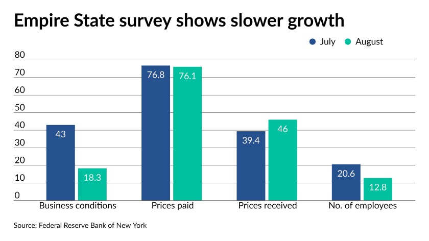 The only indicator released on Monday, the Empire State Manufacturing Survey, suggested slowing growth in the region, as the general business conditions index plunged to 18.3 in August from 43.0 in July.