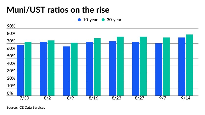 Ratios rose as a result with the 30-year muni-to-Treasury ratio settling above 80%.