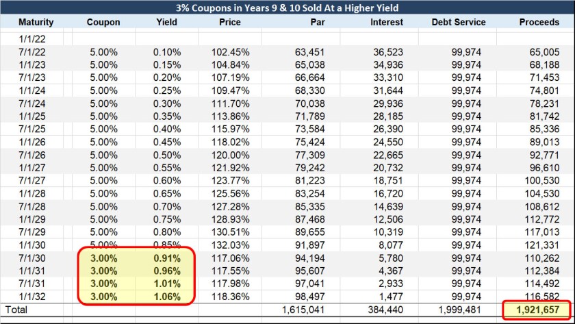 The lower coupon (even with the higher yield) results in the same proceeds, lower debt service and lower transaction yields (0.762% vs. 0.767%). If the 3% coupons are sold at the same yield as the 5% coupons, the lower coupon approach has a 1 basis point benefit in transaction yield.