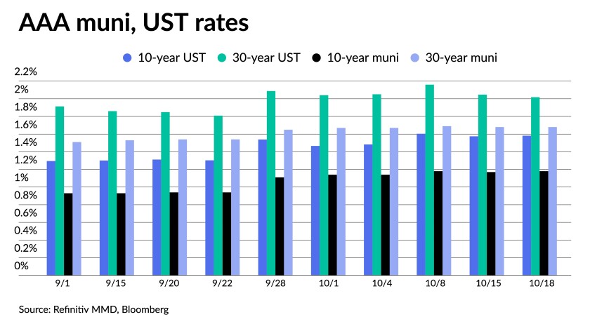 Ratios were held to near Friday’s levels, with the 10-year municipal-to-UST ratio at 74% and the 30-year at 83%, according to Refinitiv MMD. ICE Data Services had the 10-year at 73% and the 30 at 84%.