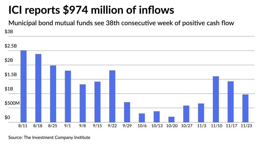 The Investment Company Institute reported $974 million of inflows into municipal bond mutual funds in the week ending Nov. 23, down from $1.430 billion in the previous week.