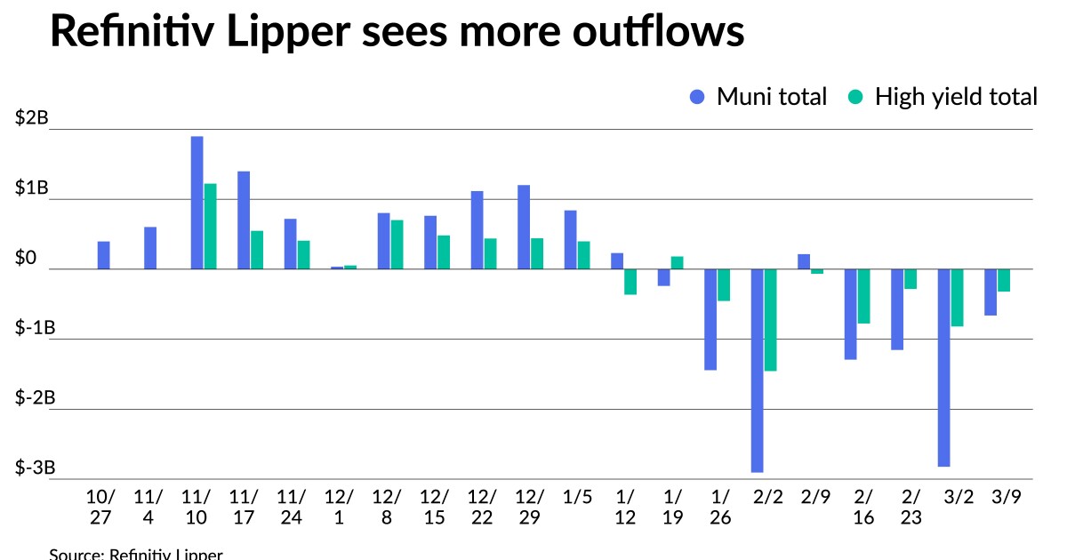 In the week ended March 9, weekly reporting tax-exempt mutual funds saw investors pull more money out with Refinitiv Lipper reporting $661.675 million of outflows Thursday, following an outflow of $2.824 billion the previous week.