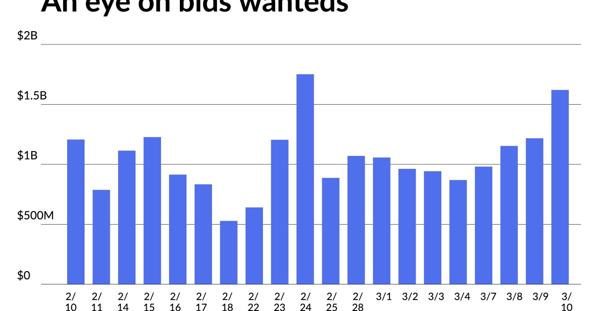 Bids wanteds reached $1.62 billion on Thursday after $1.217 billion Wednesday. Bids wanteds have eclipsed $1 billion 19 times since the start of the year.