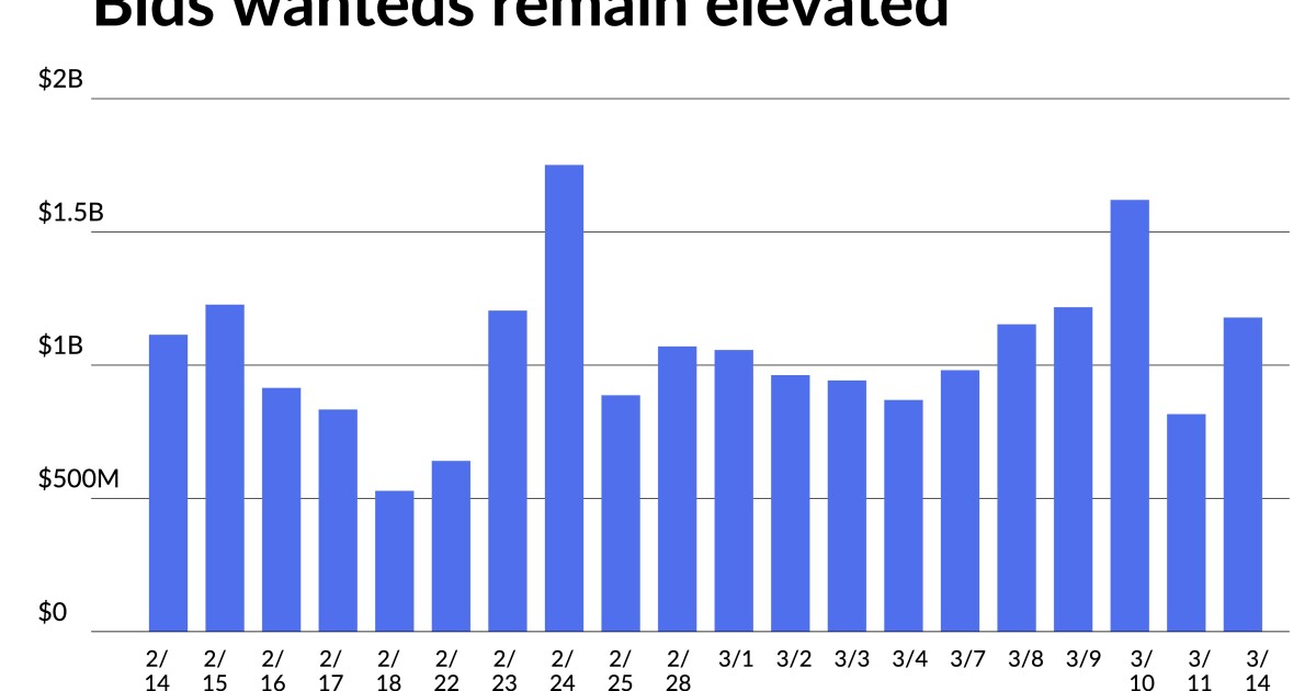 Selling pressure continues with bids wanted hitting $1.178 billion on Monday, the 20th time so far this year they’re eclipsed the $1 billion mark. At the mid-month mark, municipal returns are in the red. SO far in March, the Bloomberg main muni index has lost 1.83%, the high-yield index, 2.06%, taxables 3.78% and impact 2.42%.