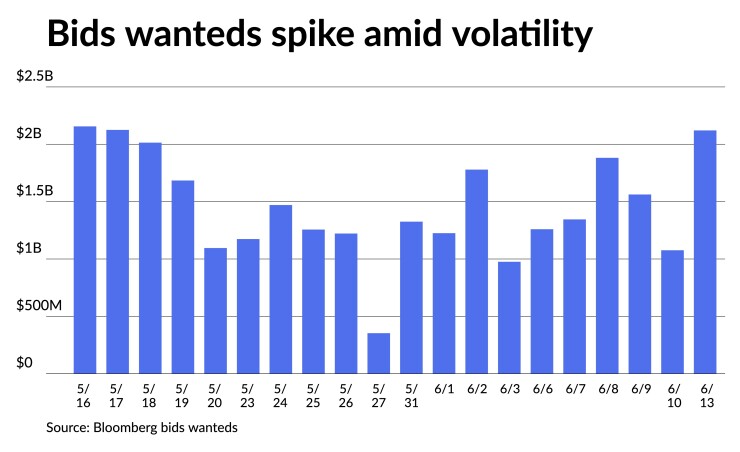 Bids wanteds spiked Monday amid the volatility, with Bloomberg’s bid system tally reaching $2.1 billion. This is 70% above the 2022 average and marks the 11th time this year the figure has exceeded $2 billion.