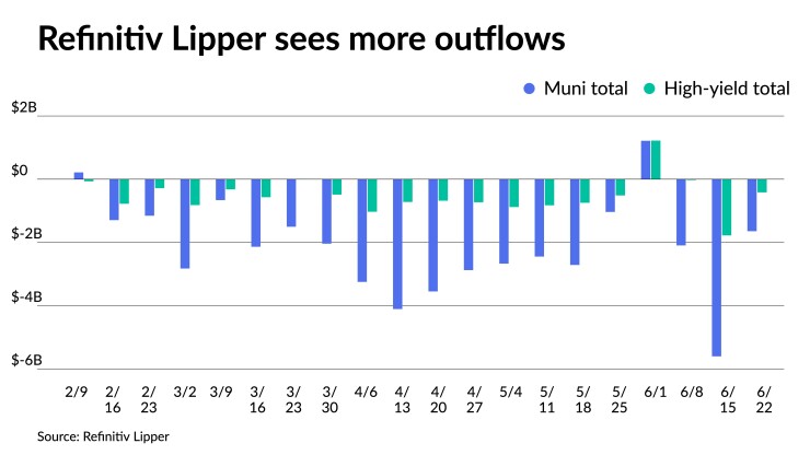 Investors pulled more from municipal bond mutual funds, with Refinitiv Lipper reporting $1.6 billion of outflows, down from the $5.6 billion the week prior and brings the total to $45.7 billion year-to-date.