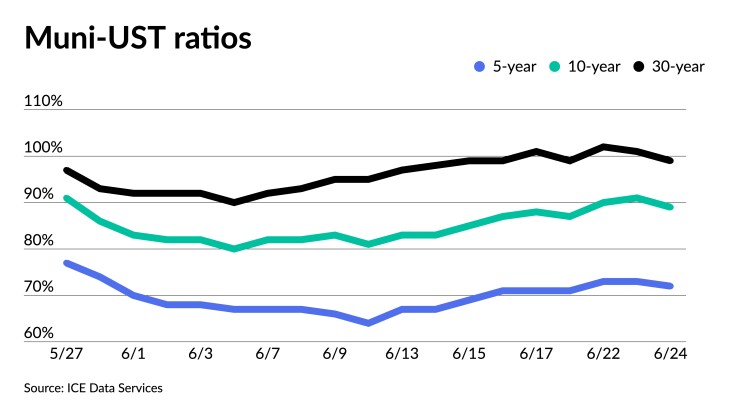Muni-UST ratios, they noted, rose slightly “from the more reasonable levels of early June, though the 10-year and shorter maturity ratios rise are more tempered.” Only the 30-year ratio topped 100%, which may prove attractive to some crossover accounts.