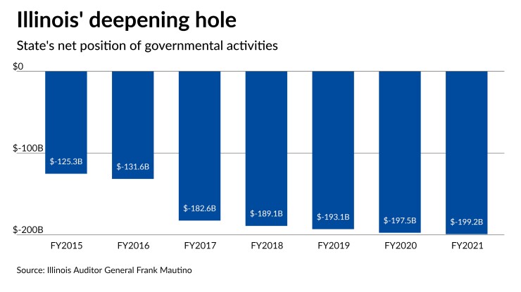 The net position of governmental activities — which provides a deeper view of the state’s assets measured against obligations — worsened by $1.7 billion, bringing the gap to $199.2 billion, the worst among states that had released their fiscal 2021 audits by June 8, according to state Auditor General Frank Mautino’s report. “Over time, increases and decreases in net position measure whether the state’s financial position is improving or deteriorating,” according to the audit.