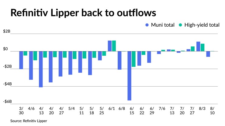 Long-term muni bond funds had outflows of $322.342 million in the latest week after inflows of $1.287 billion in the previous week. Intermediate-term funds had outflows of $81.512 million after inflows of $42.336 million in the prior week.