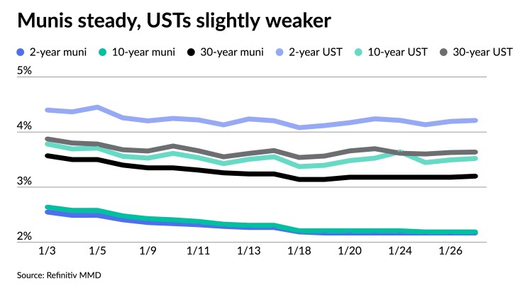 Washington 5s of 2038 at 2.98% versus 2.92%-2.90% original on 1/19. LA DWP 5s of 2042 at 3.17%-3.16% versus 2.98%-2.99% on 1/19 and 3.29%-3.28% on 1/11. Tomball ISD, Texas, 2043 at 3.24%-3.23% versus 3.23% Thursday and 3.23%-3.19% on 1/18.