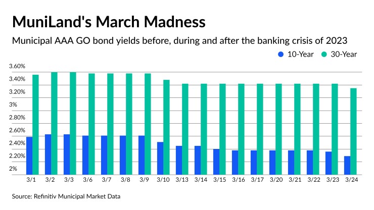 Since the start of the banking crisis on March 10, the 10-year muni yield has dropped 22 basis points, while the 30-year has fallen 13 basis points, according to MMD. At the start of the month, the 10-year muni stood at 2.59% while the 30-year was at 3.56% on March 1.