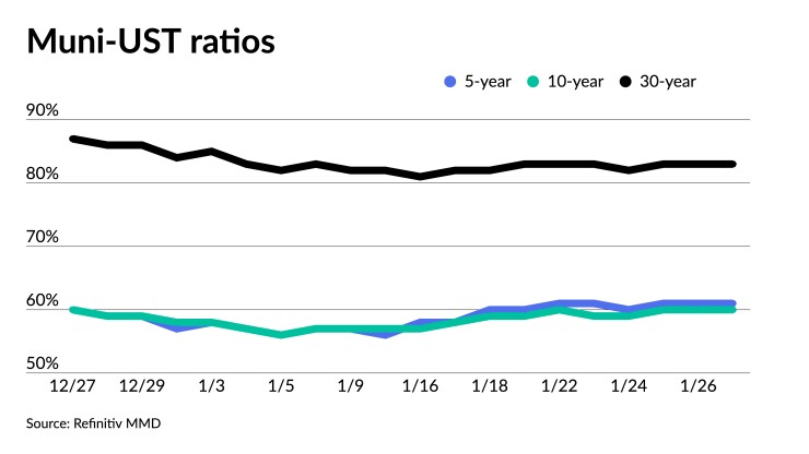 The two-year muni-to-Treasury ratio Monday was at 63%, the three-year at 63%, the five-year at 61%, the 10-year at 60% and the 30-year at 83%, according to Refinitiv Municipal Market Data’s 3 p.m. EST read. ICE Data Services had the two-year at 64%, the three-year at 63%, the five-year at 61%, the 10-year at 60% and the 30-year at 82% at 3 p.m.