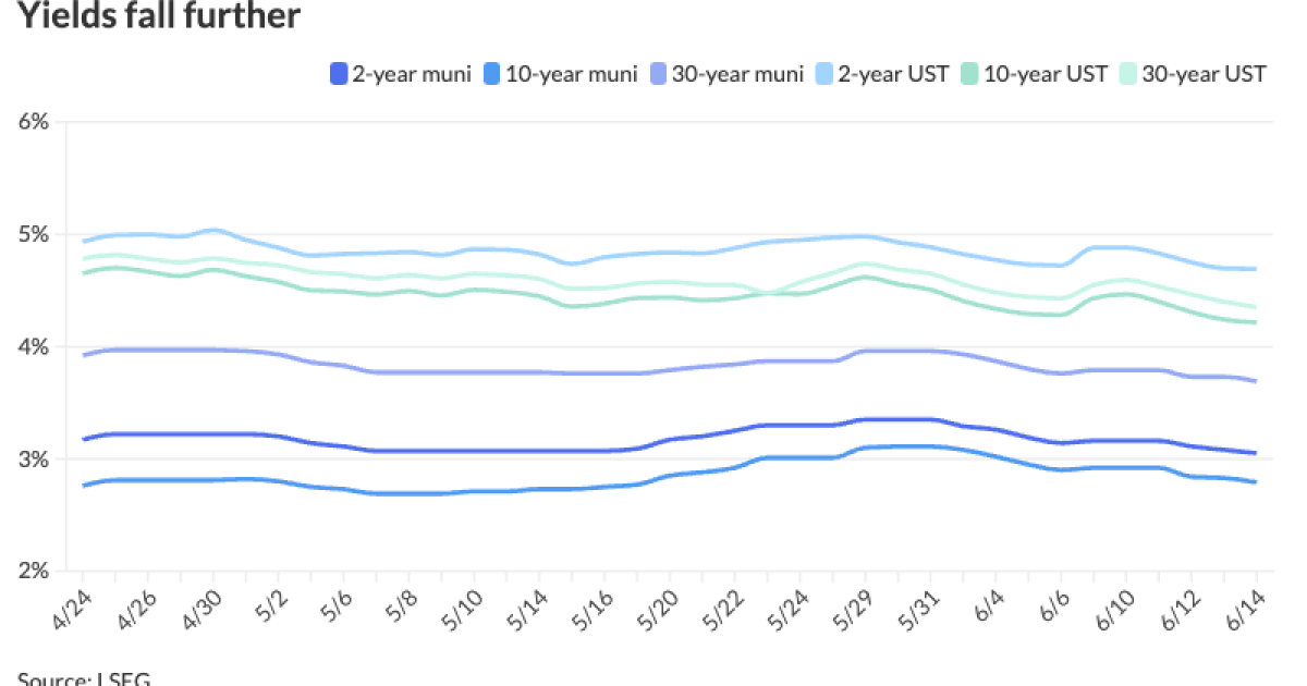 The S&P Global Market Intelligence municipal curve was bumped four to five basis points: The one-year was at 3.14% (-4) in 2025 and 3.07% (-4) in 2026. The five-year was at 2.84% (-5), the 10-year was at 2.81% (-5) and the 30-year yield was at 3.68% (-5) at 3:30 p.m.