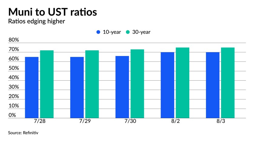 Municipal-to-UST ratios were little changed, but have edged higher in recent trading sessions. ICE Data Services showed the 10-year muni/UST ratio at 71% and the 30-year at 74%. Refinitiv MMD had ratios at 70% in 10 years and 75% in 30.