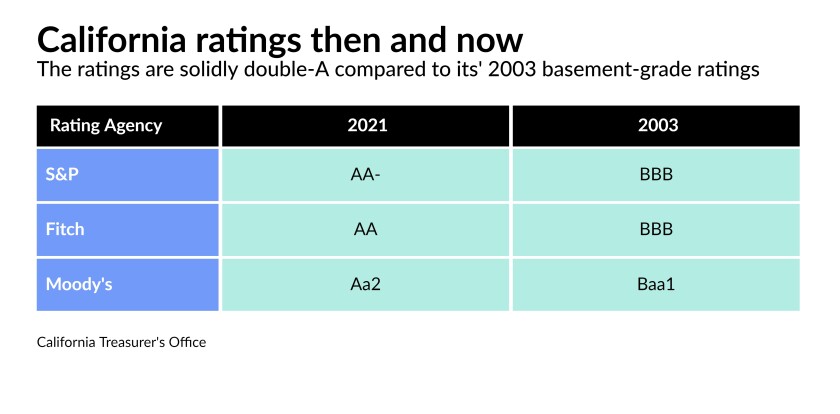 Voters in 2010 approved a state constitutional amendment that allows state lawmakers to pass a budget with a simple majority. That and other changes, including former Gov. Jerry Brown’s fiscal conservatism and commitment to “paying down the wall of debt,” changed the dynamic in Sacramento resulting in the state’s ratings climbing from triple-B territory into today’s double-A levels.