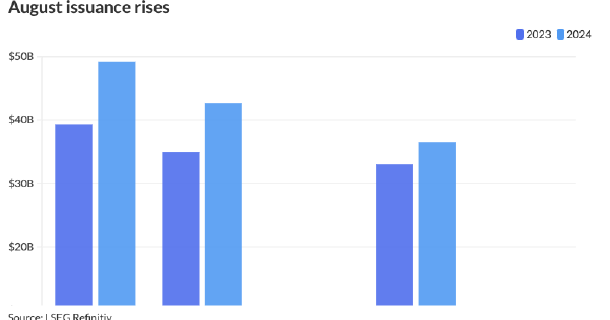Revenue bond issuance increased 24.9% to $29.809 billion from $23.876 billion in August 2023, and general obligation bond sales rose 25.3% to $19.365 billion from $15.454 billion in 2023.